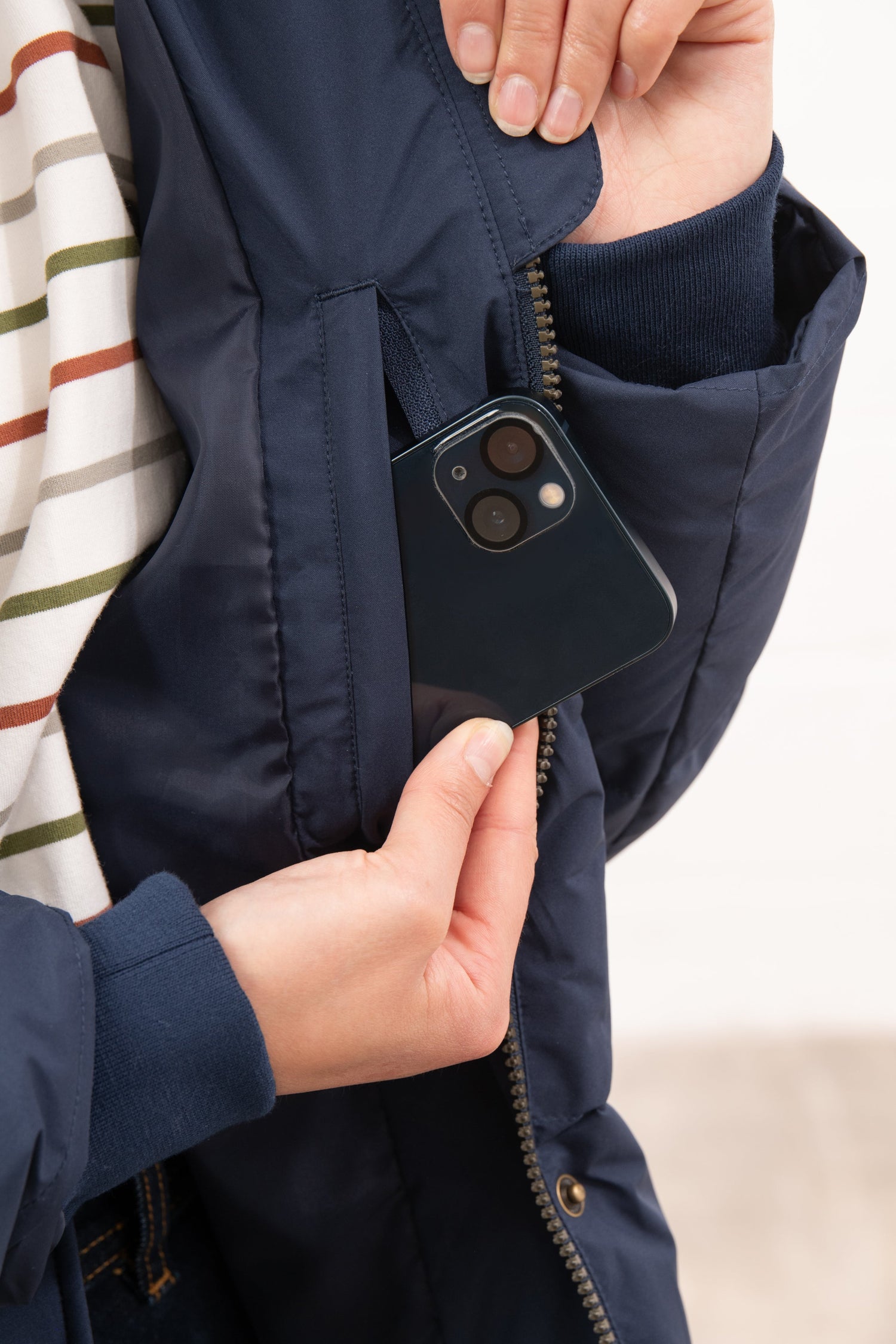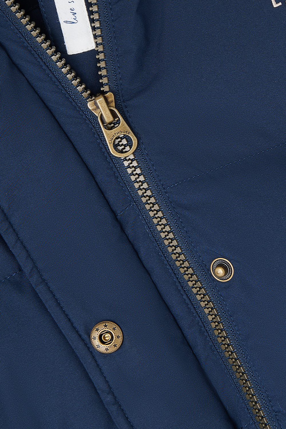 Stay warm and stylish with the Lighthouse Margot Ladies Coat in Navy. This hip-length coat features 280g of 100% recycled wadding, offering dependable insulation for chilly days. Its water-repellent exterior keeps you dry, while the adjustable, detachable hood and roomy fit provide versatile comfort and layering options. Designed for everyday wear, Margot includes practical details like storm cuffs, secure pockets, and a two-way zip, making it the perfect blend of function and fashion for colder weather.