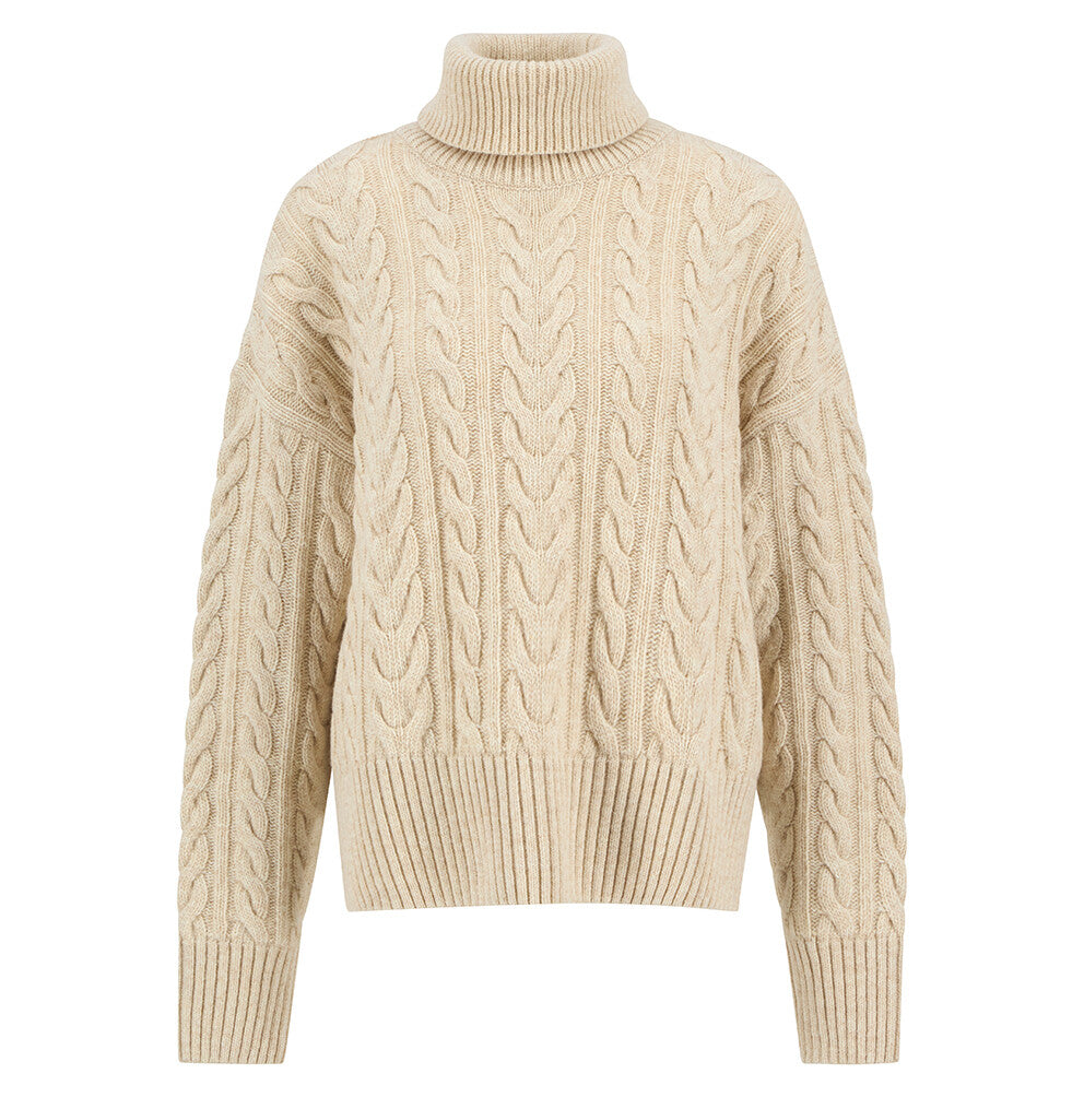 Stay warm and stylish with the women's Barbour Embleton Knitted Jumper in Birch. Crafted with a traditional cable knit and a cosy roll neck, this jumper offers exceptional comfort and insulation on chilly days. Its ribbed cuffs and hem ensure a snug fit, while the slim metal Barbour ID bar adds a subtle mark of quality. Ideal for autumn and winter walks or relaxed weekends, this timeless piece combines classic design with practical warmth. Embrace comfort and elegance effortlessly with this essential wardrobe staple.