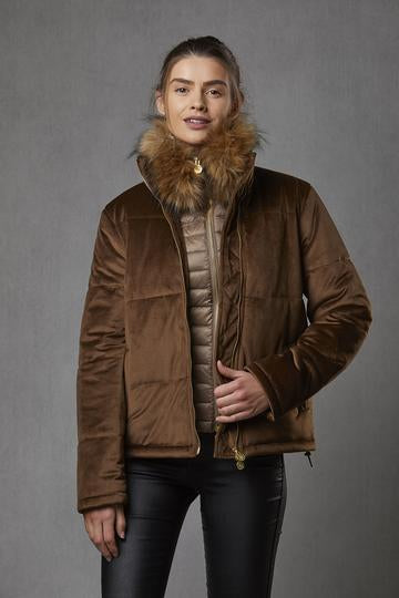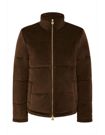 Ella is a beautiful, luxurious easy fit padded jacket. This wonderfully soft velvet has a rich texture which makes it look bronzy brown as it moves with the light and adds to its appeal. The body shape is relaxed, with a square body cut, but two hidden elasticated toggles allow the lower hem to be pulled tight for a close a fit and to change the look.