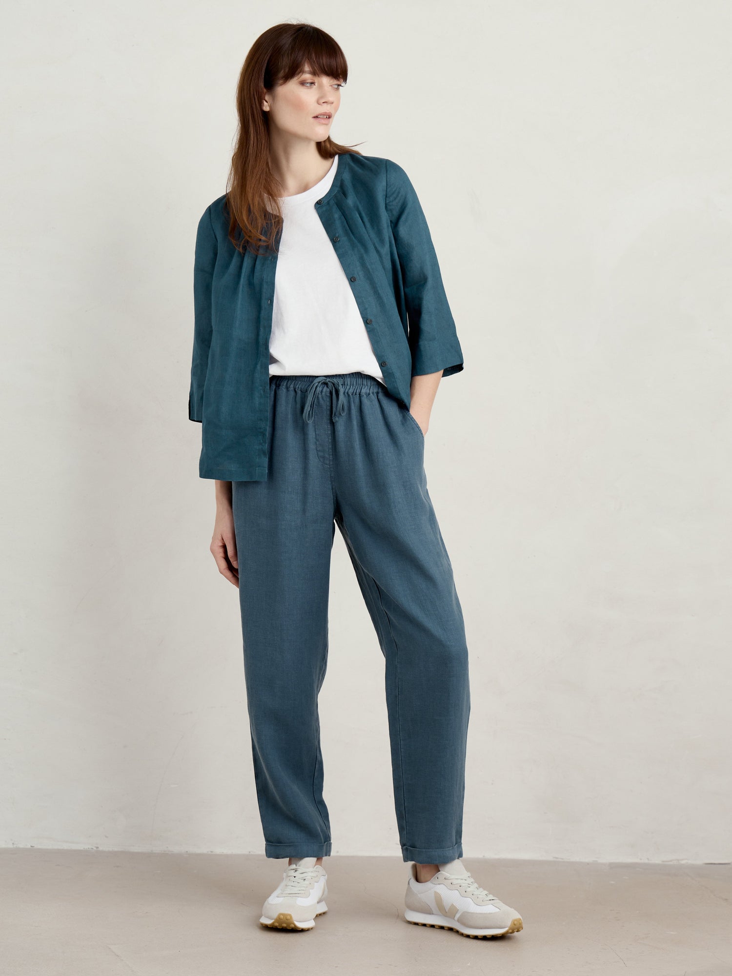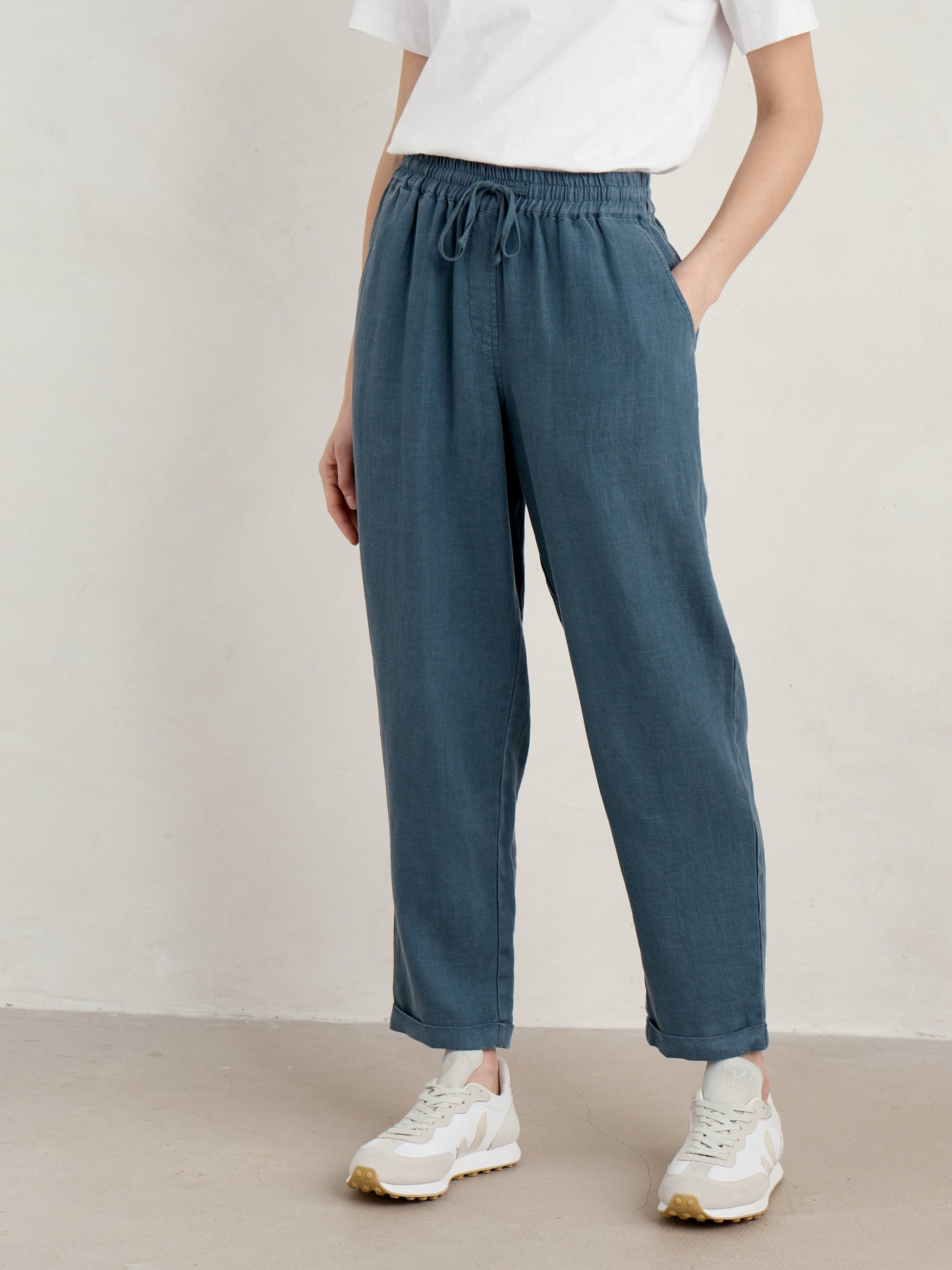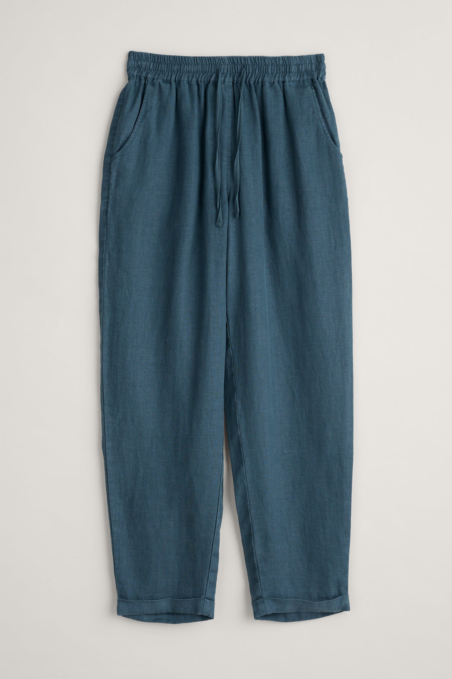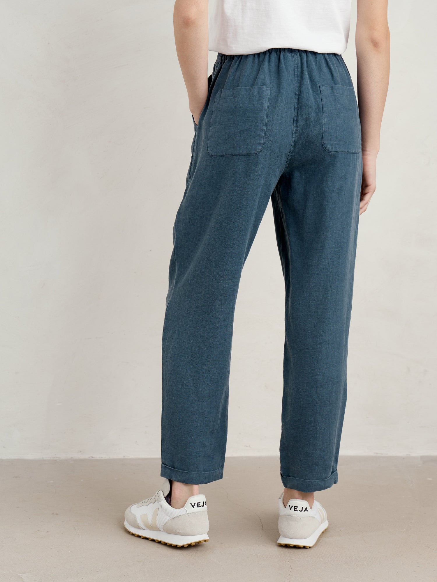 Linen trousers with a contemporary, relaxed silhouette and tapered legs. This style has been garment-dyed for rich colour with unique highs and lows. Finished with a soft elasticated waistband, tie waist, side pockets and back patch pockets. They’ll become softer and smoother with every wash and wear.