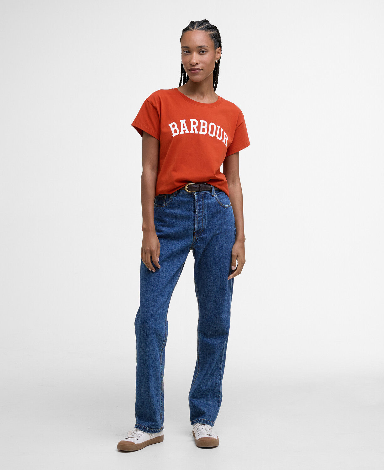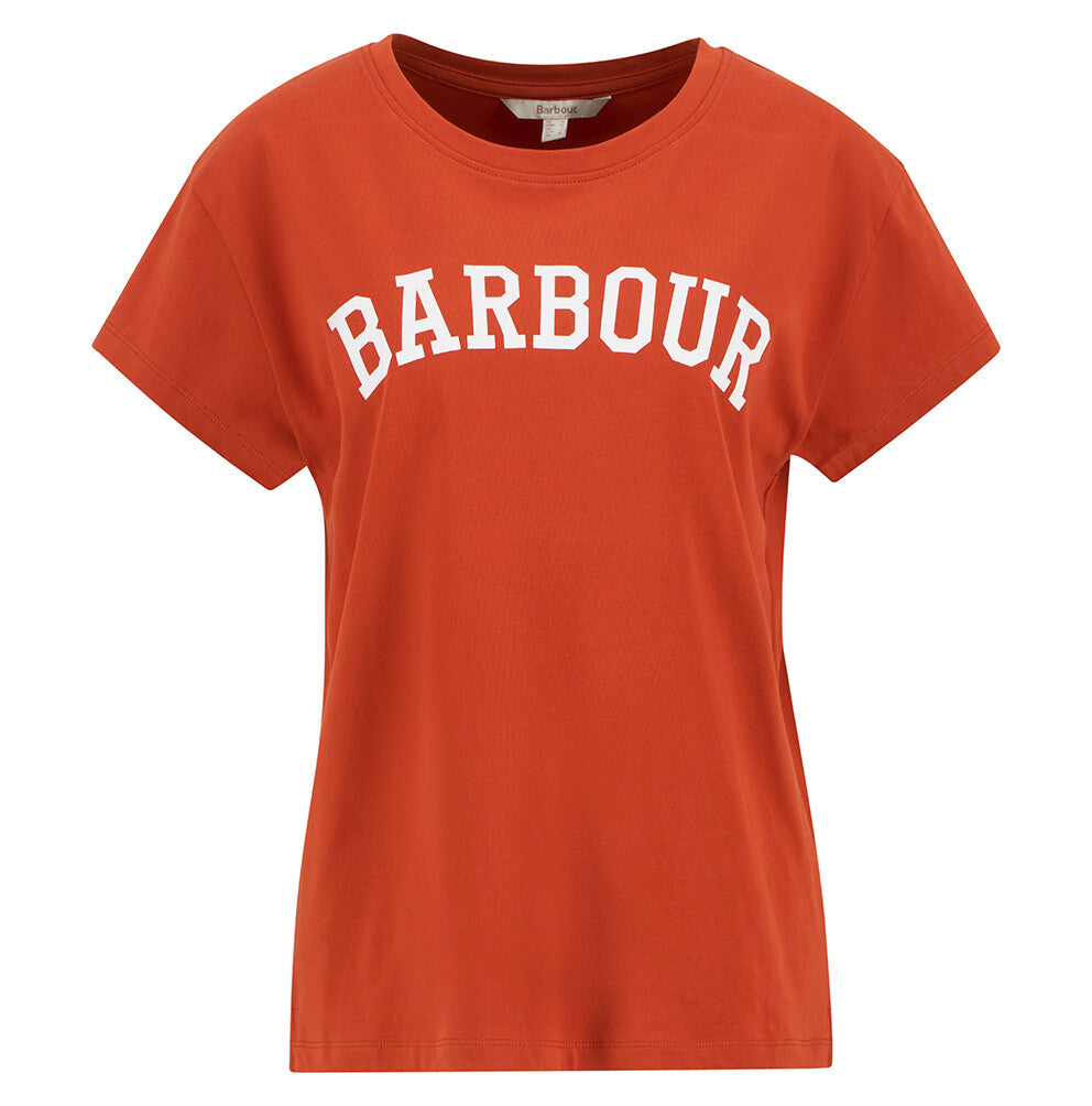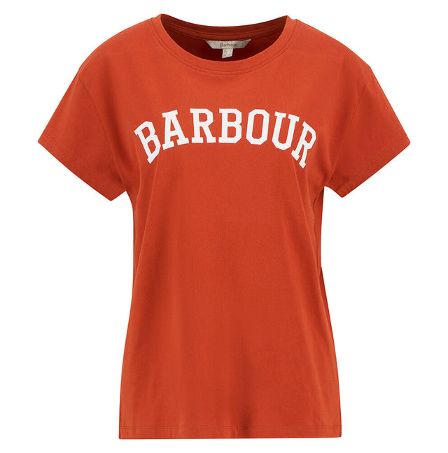 The Barbour Northumberland Classic T-Shirt in vibrant orange combines timeless style with everyday comfort. Featuring the iconic Barbour varsity print on the chest, this relaxed-fit tee is perfect for casual outings. Its soft fabric and easy silhouette make it an ideal choice to pair with jeans or shorts, adding a touch of effortless cool to your wardrobe. Elevate your casual look with this essential Barbour piece.