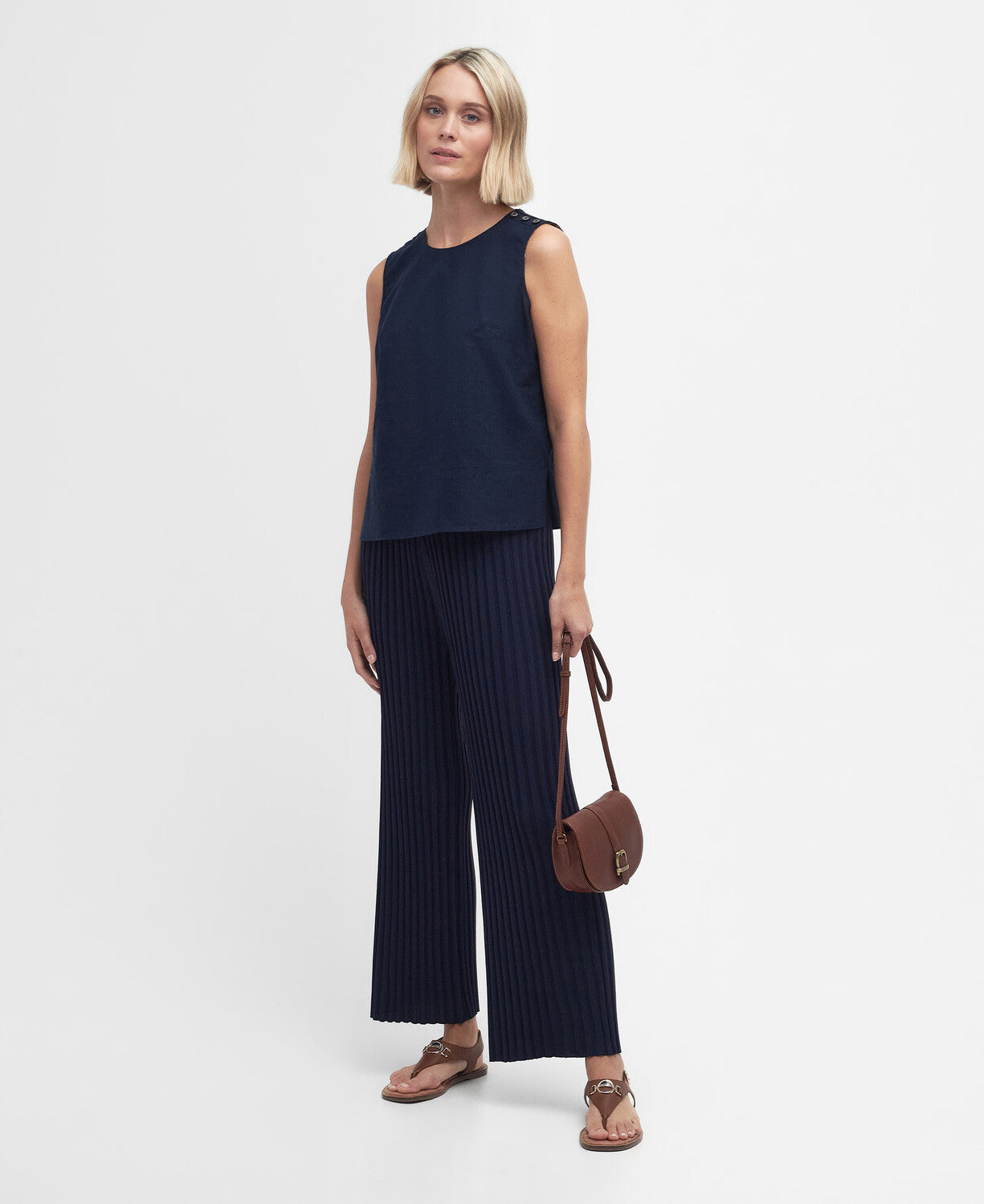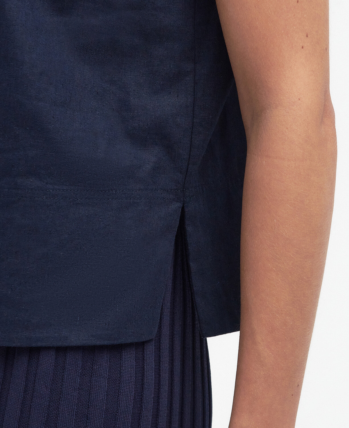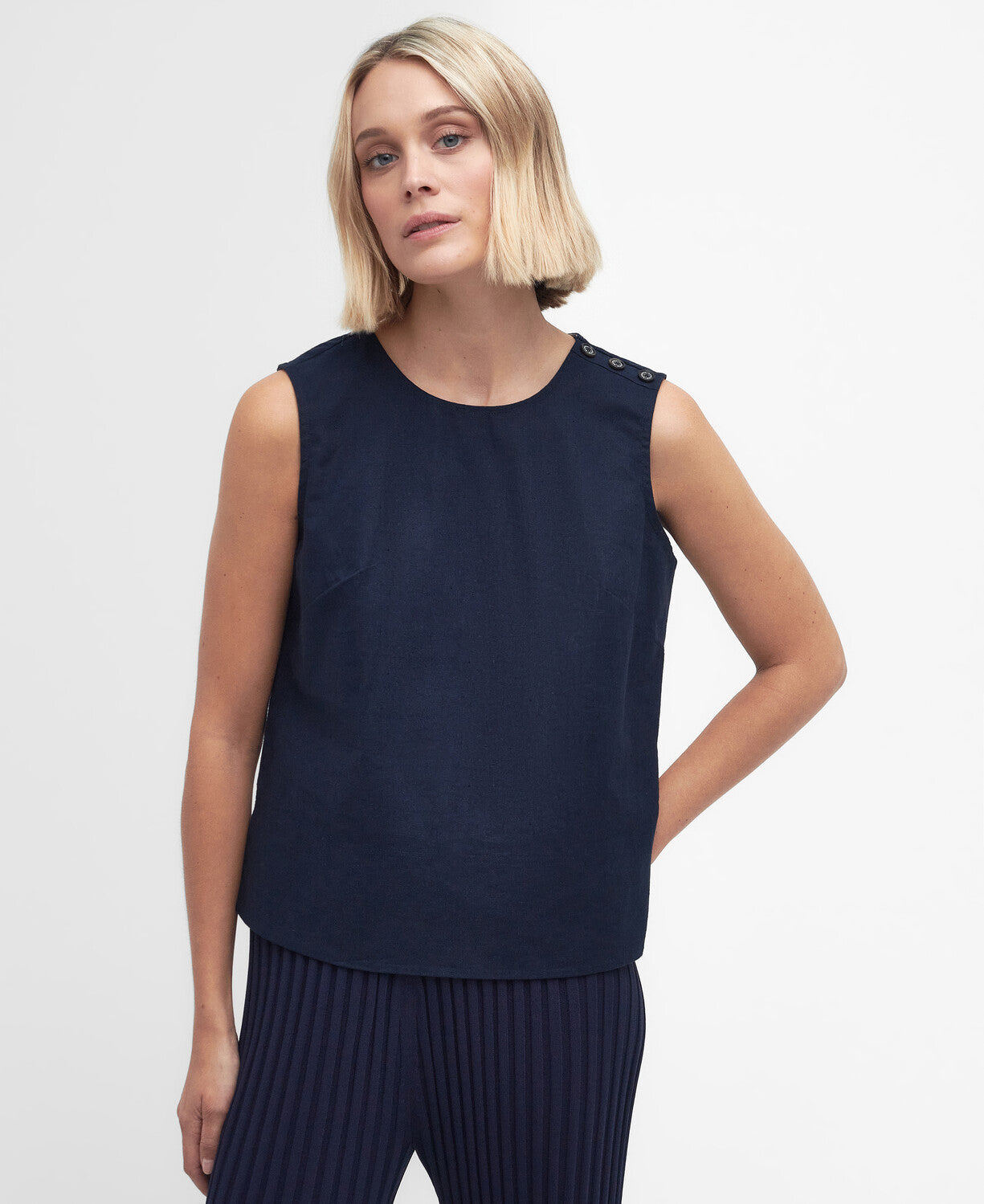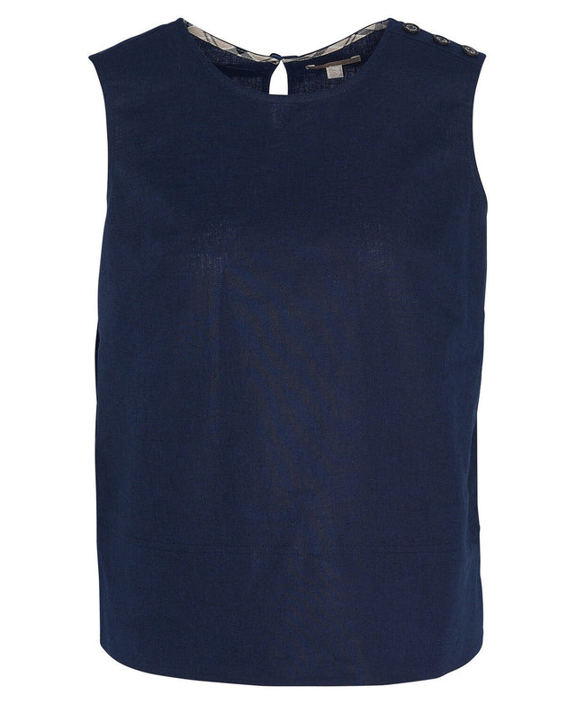 Cotton linen shell top with soktas in back neck and mock horn buttons on the front shoulder placket. Keyhole opening to centre back featuring a Barbour metal ID bar.
