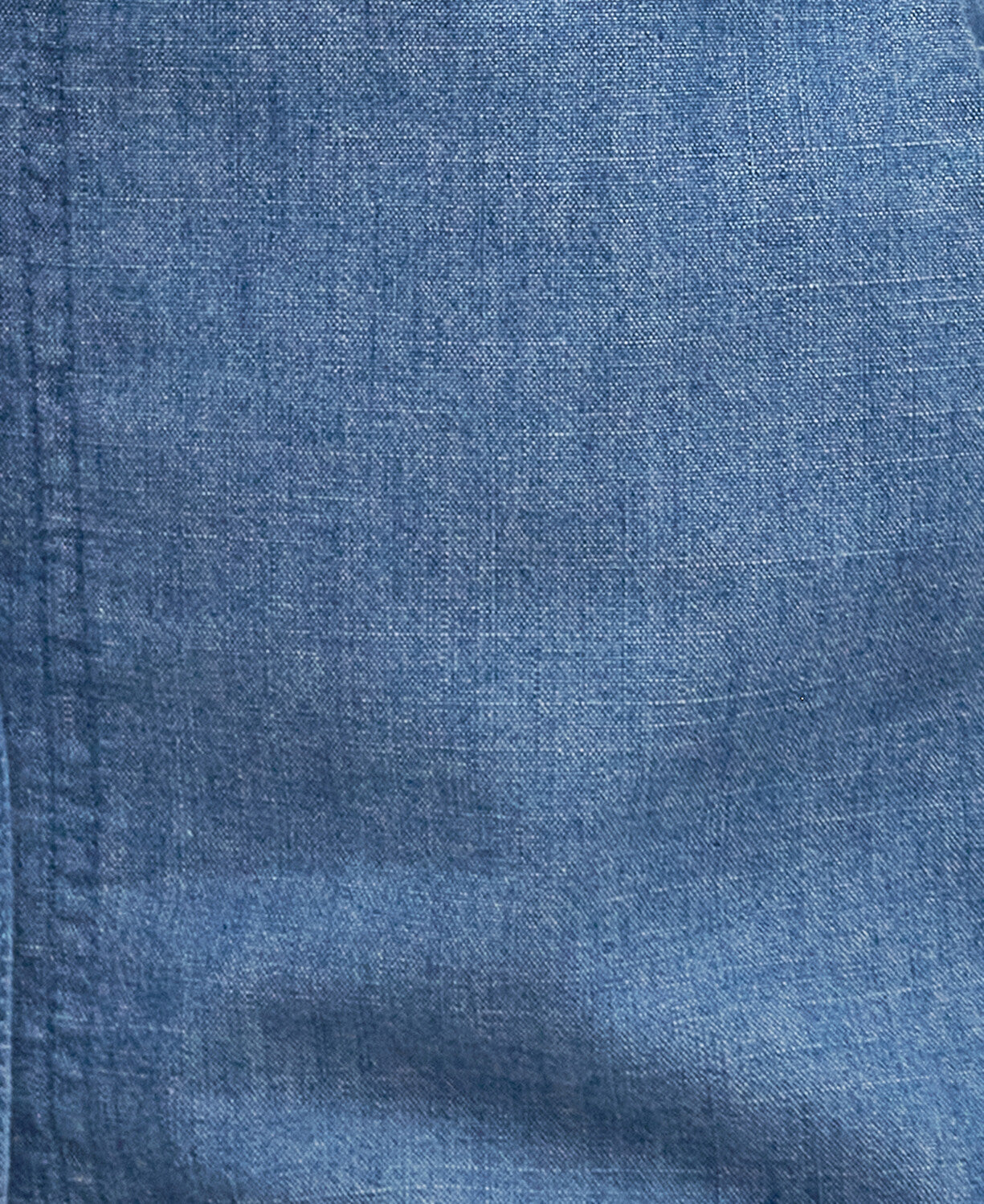 Square neckline cotton chambray jumpsuit with mock horn button fastening. Self-fabric tie at the waist and elastic opening at cuffs with a ruffle edge finish.